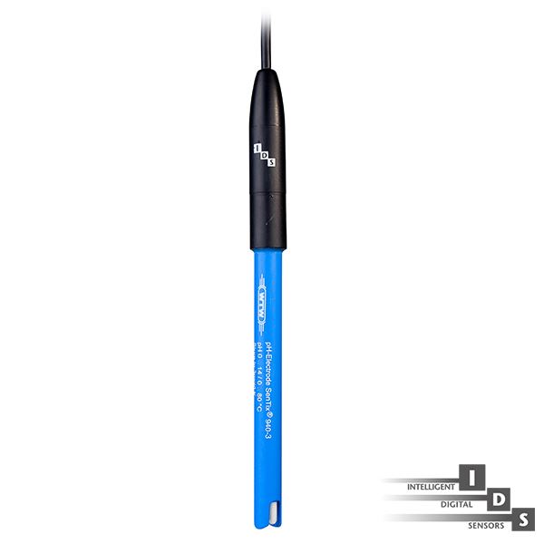 IDS pH combination electrode with gel electrolyte, plastic shaft, and integrated temperature sensor. QSC function. Electrode incl. 3 m fixed cable with a waterproof digital connector. For MultiLine® MonoLine, and inoLab® IDS.