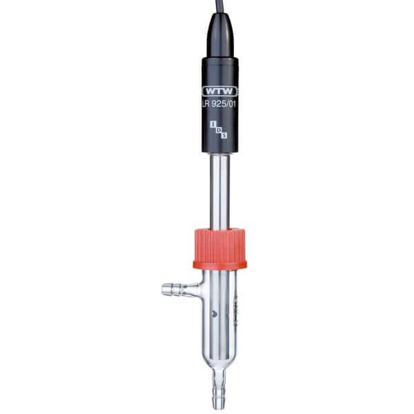 2-electrode IDS conductivity cell with stainless steel electrodes for ultra-pure water, cell constant 0.1 cm–1, featuring a 1.5 m fixed cable with a waterproof digital connector, and a glass flow-through vessel.