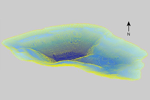 Map showing the depth contours of the Berkeley Pit, a former open-pit copper mine filled with acidic water.