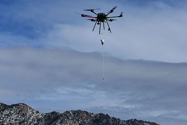 Battery life is precious and short, especially on a heavily loaded drone, so Fairweather and his equipment operator, Brandt Winkelman, focus on efficiency to reach the sampling location, capture the measurements, and fly the WaSP back to their rocky overlook within 20 minutes.